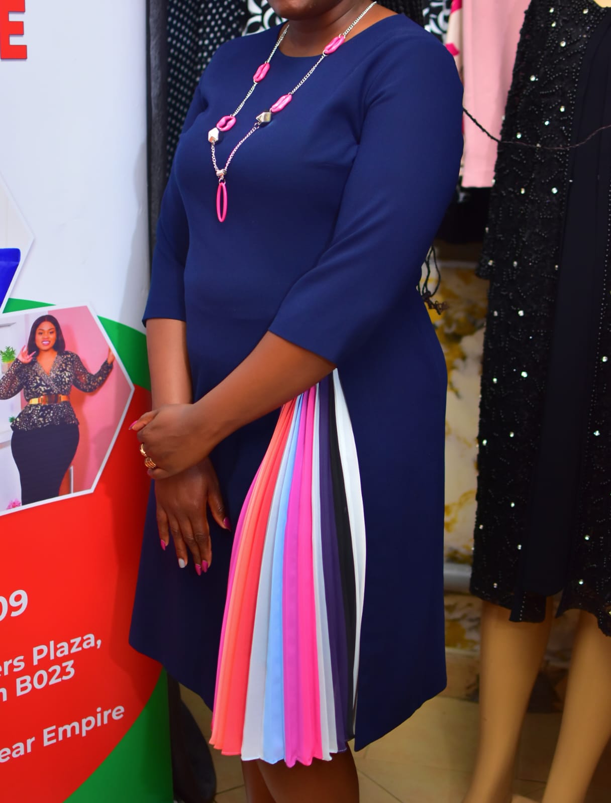 Elevate your wardrobe with this exquisite Turkey-import pleated panel dress, exclusively from Turkey Wear Empire. This sophisticated navy blue A-line dress features a striking, multi-colored sunray pleated insert that adds a vibrant, modern twist to a classic silhouette. Crafted with the high-quality fabric and tailoring that Turkish fashion is famous for, it offers a flattering fit for the modern Kenyan woman.
